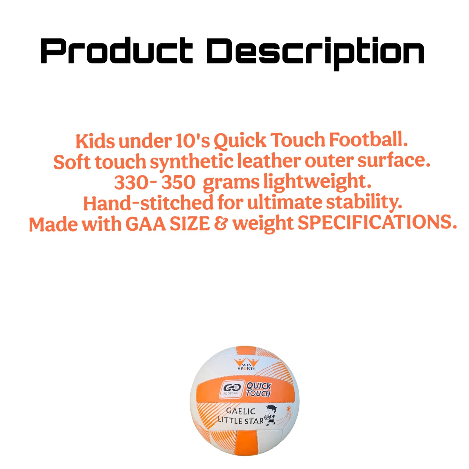Junior Stars under 10's Quick Touch Football. Soft touch synthetic leather outer surface. 330- 350 grams lightweight. Hand-stitched for ultimate stability. Made with GAA SIZE & weight SPECIFICATIONS.